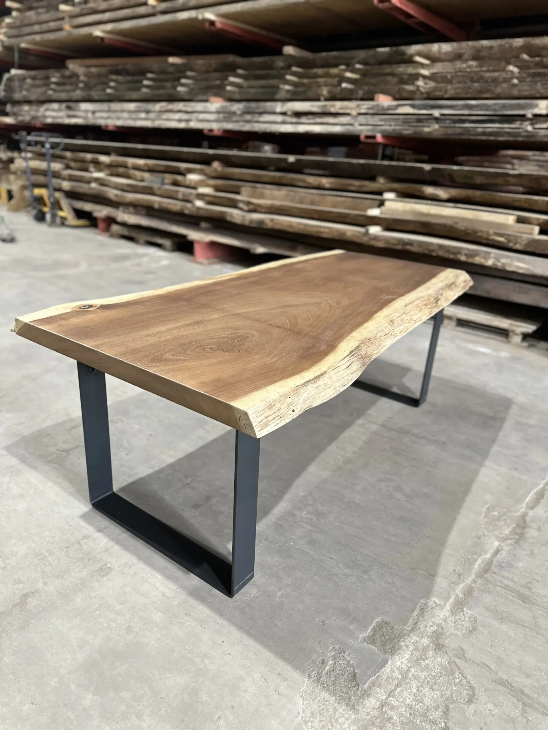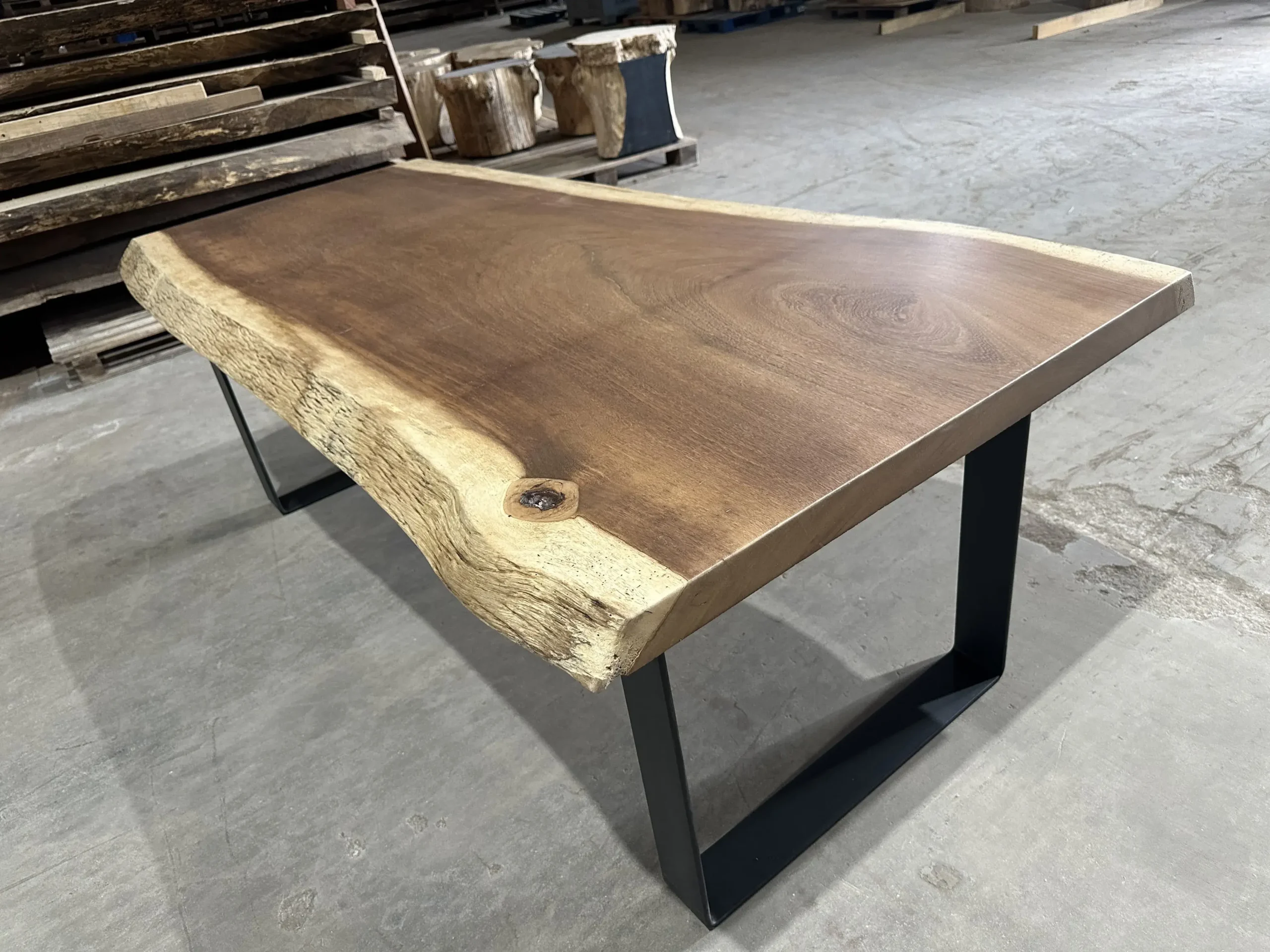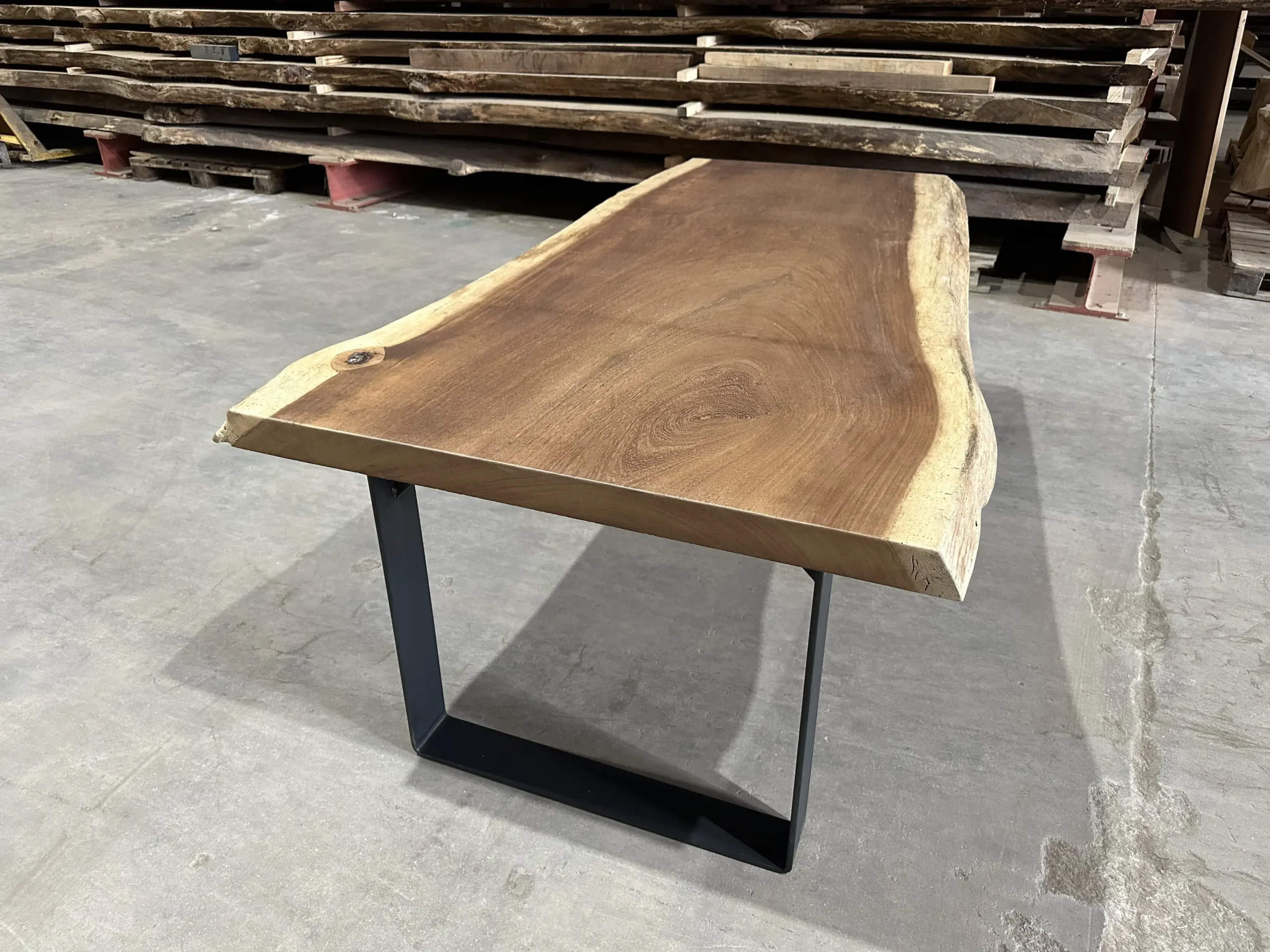 Mesa rectangular fabricada en madera maciza de iroko, de medida 200 cm de largo, 90 cm de ancho y un grosor de 6 cm. Acabado natural. Incluye las patas estándar de hierro de diseño. Ideal para 6-8 comensales.