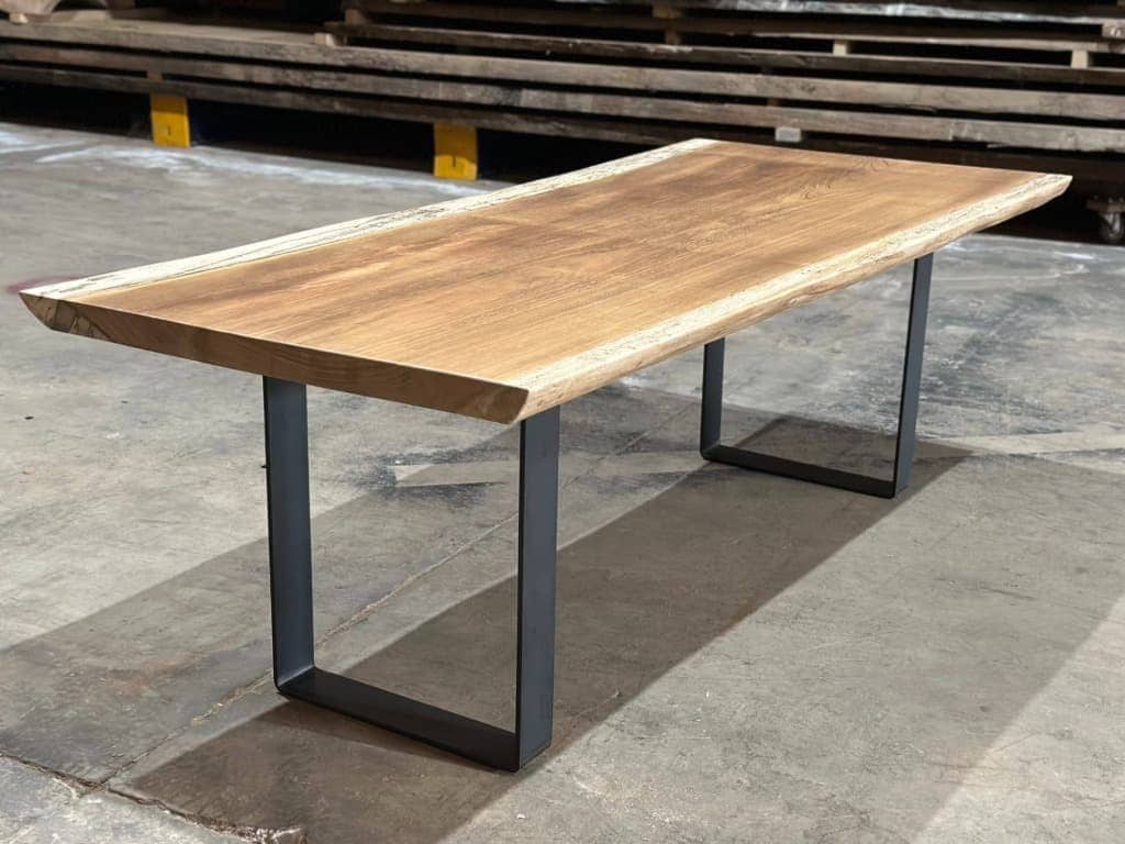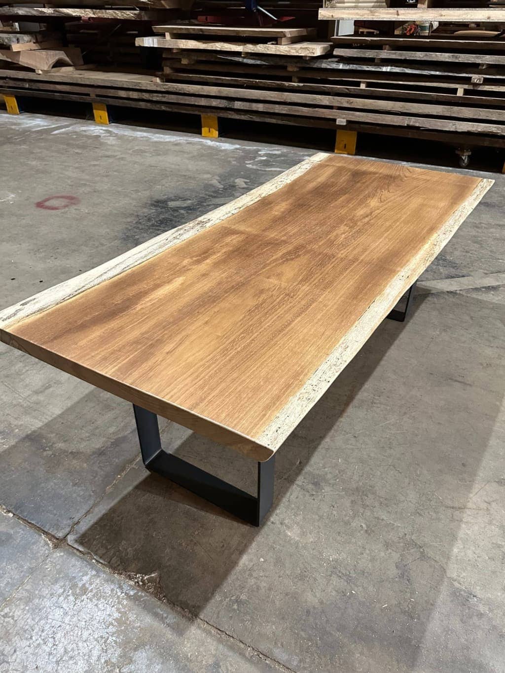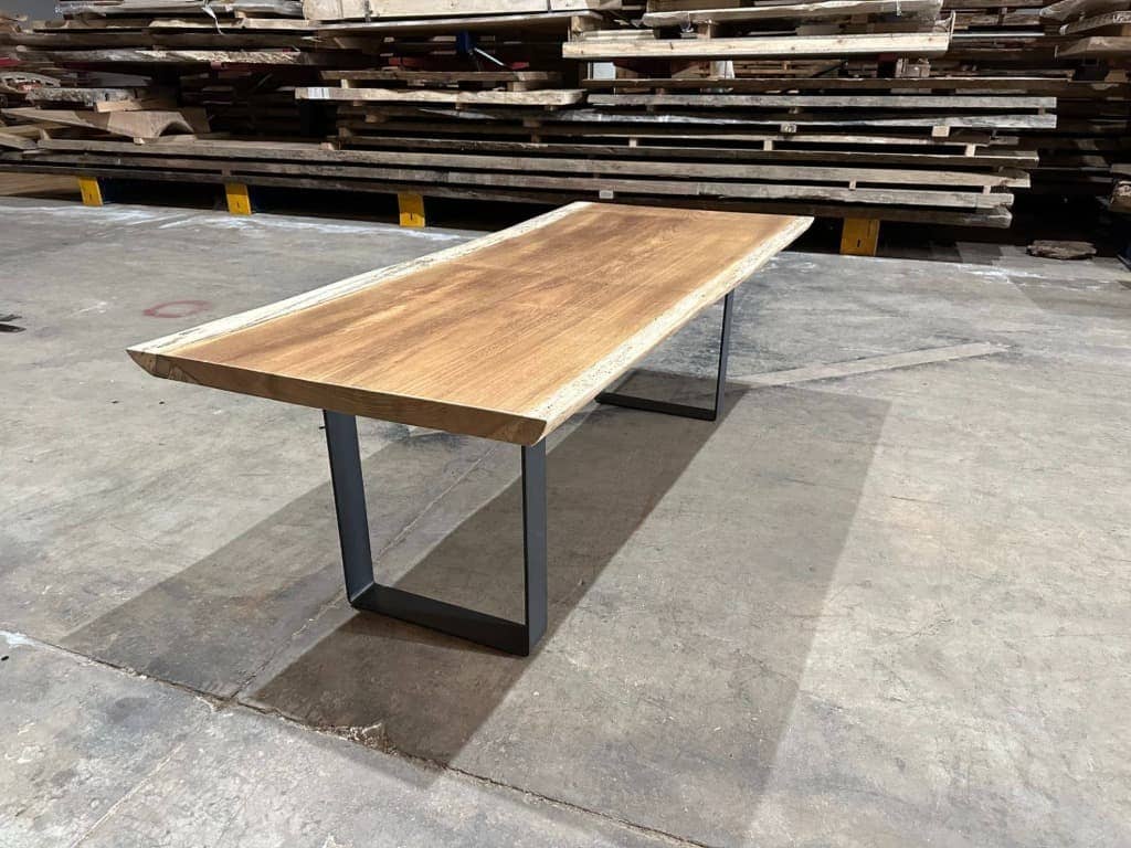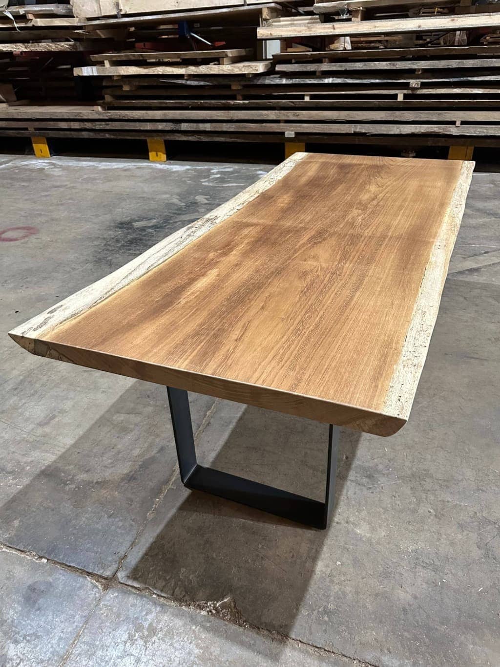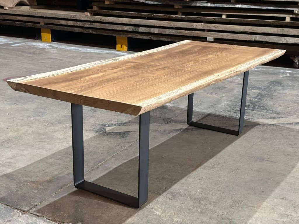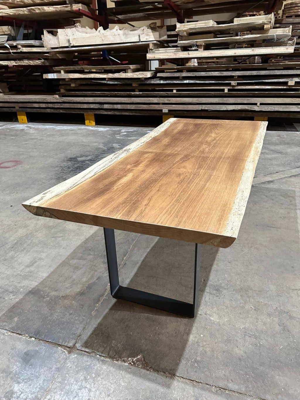 Mesa rectangular fabricada en madera maciza de iroko, de medida 220 cm de largo, 100 cm de ancho y un grosor de 6 cm. Acabado natural. Incluye las patas estándar de hierro de diseño. Ideal para 6-8 comensales.